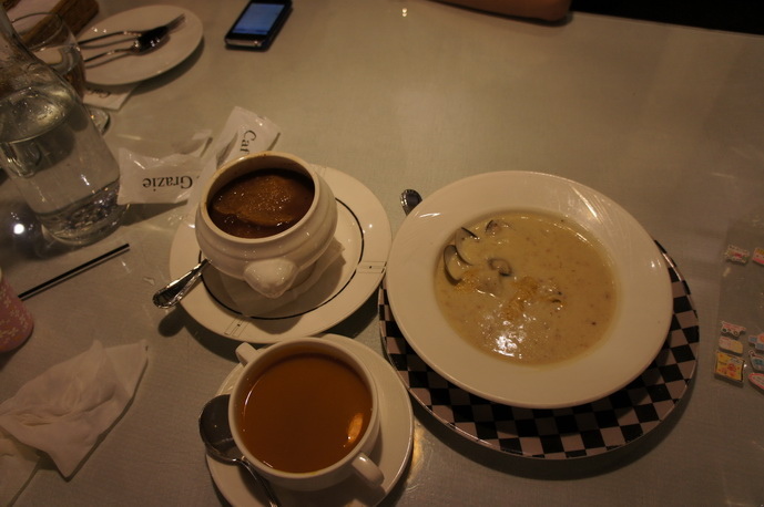 三道湯品:南瓜湯,洋蔥湯,雞肉蘑菇湯